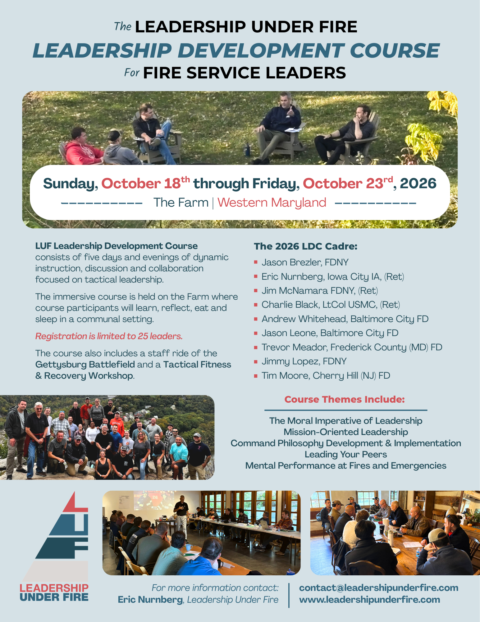 Design for Leadership Under Fire’s yearly events Fireground Command Course Retreat, Online Development Course, and Leadership Development Course each focusing on improving readability across print and digital formats to increase awareness and drive leader participation in each event.